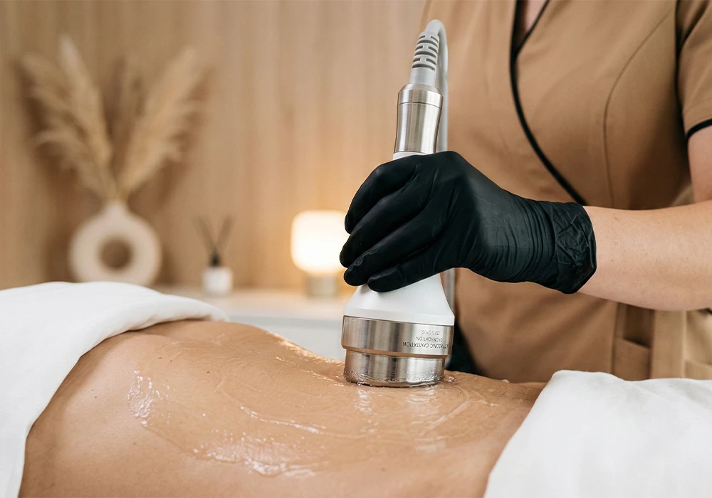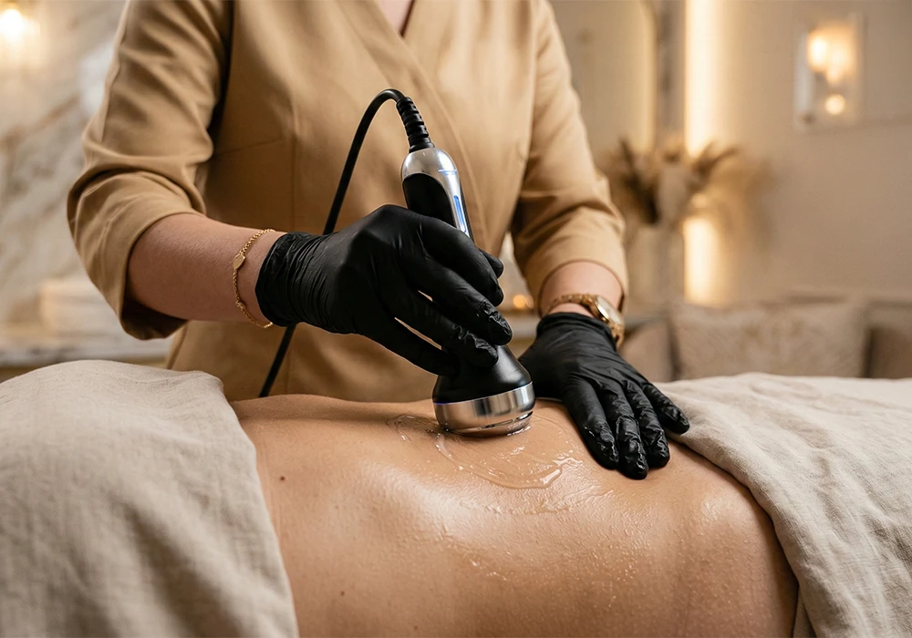 Your experience begins with a warm mineral foot soak and calming herbal tea ritual, allowing the nervous system to relax while gently initiating lymphatic flow. Advanced ultrasound cavitation is then performed on one client-selected area to target localized fat, followed by infrared thermal therapy to enhance circulation and metabolic activity.